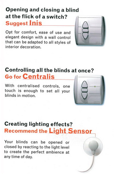 At the simple push of a button your blinds come alive - and with a choice of handsets available, you can control all your equipment simultaneously or separately.